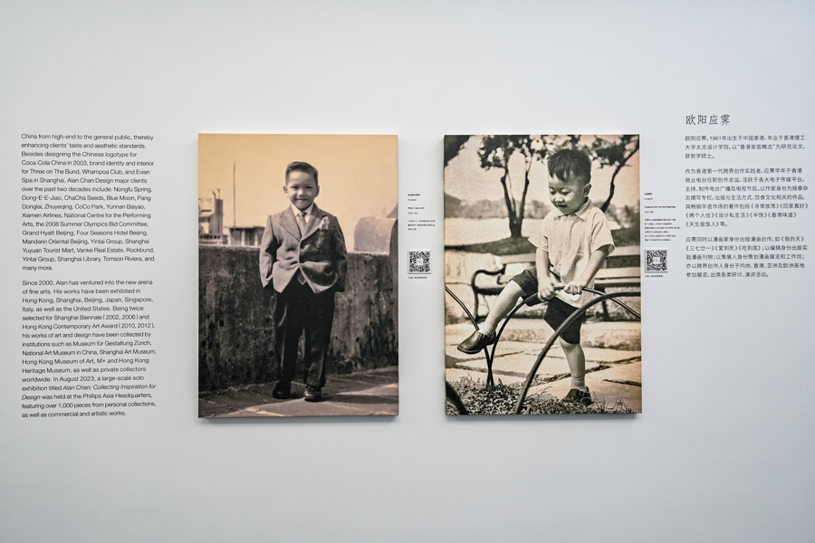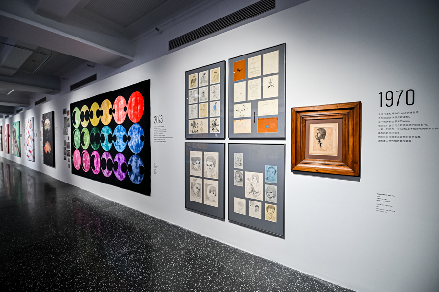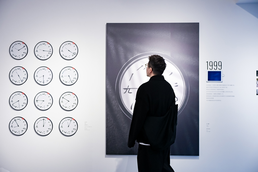 《上海滩》的歌词是贯穿展览的主线,第一部分“永不休”聚焦两位艺术家跨越数十年的创作轨迹与坚守,如陈幼坚的《中学民歌合唱团》旧照、欧阳应霁的《从来跨界》旧照等,串联起他们以艺术回应时代、突破边界的“向前意志”。其中,陈幼坚的装置作品《汉字巧思》尤为引人注目,这件作品也成为了解艺术家创作理念的一把钥匙。方小龙阐释,“这个时钟上从一到十二的每一个数字,都缺少了一笔。当指针走到某个数字时,缺失的笔画就会被补齐。比如现在指针指向‘十二’,这个数字就完整了;转到‘七’时,‘七’就会被补全。”方小龙表示,“这个设计的精妙之处在于,它隐喻着我们的人生。在某个时刻总会有遗憾,但从另一个角度看,当我们慢慢填补这些遗憾时,其实也是在走向另一种完美。”这件作品从香港远道而来,十二个钟表原件都是陈幼坚的设计原作,完美体现了陈幼坚“东情西韵”的设计理念,既蕴含东方智慧,又展现出现代设计的美感。